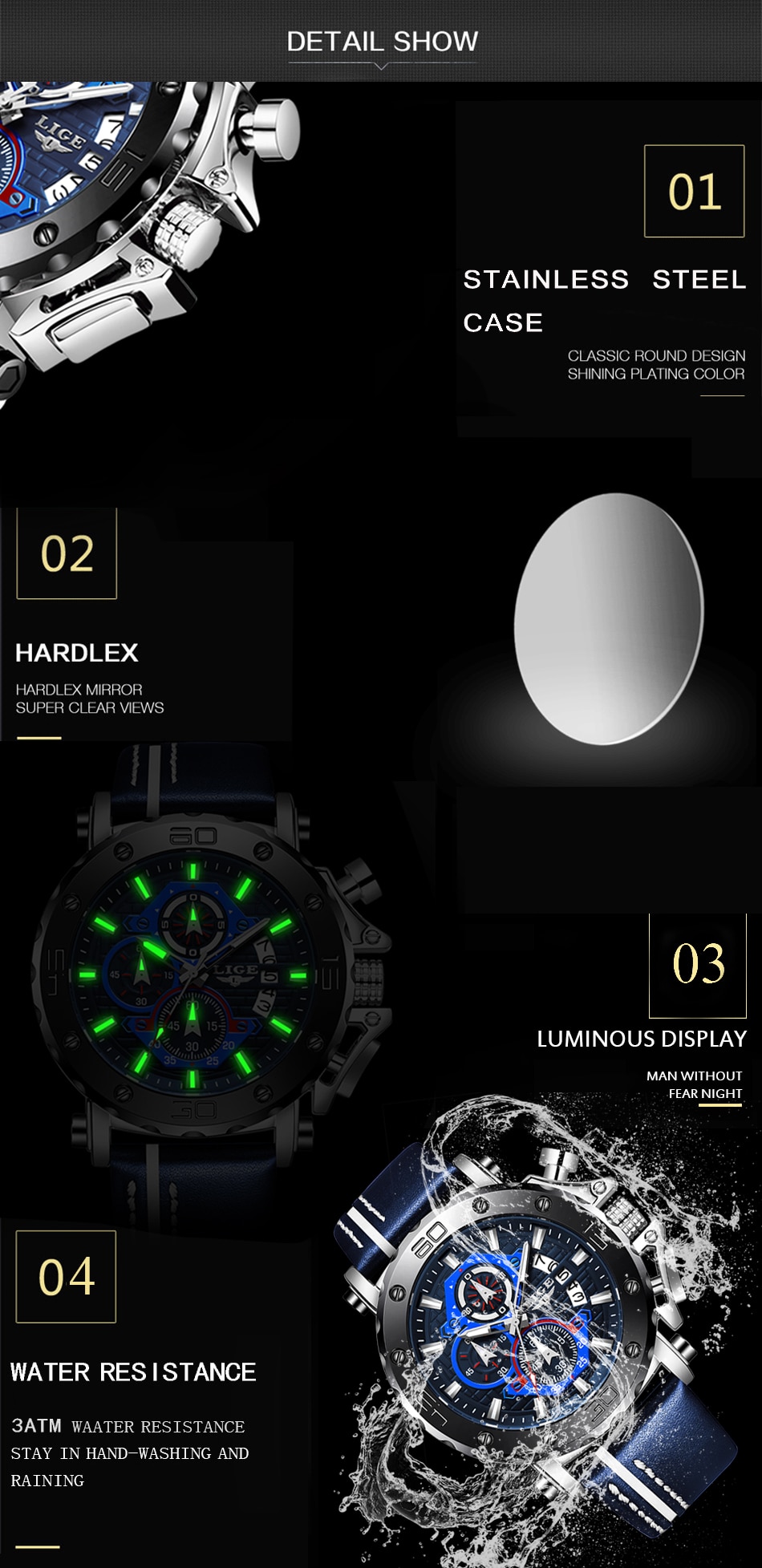 -Stainless steel, high-strength mineral glass, 30 meters life waterproof, luminous hands, timer function, stylish creative dial, 100% visual impact