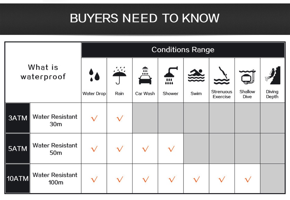 -3ATM / 30M waterproof (supports cold water shower and swimming, do not operate the watch when underwater, does not support hot water);
