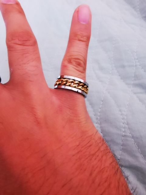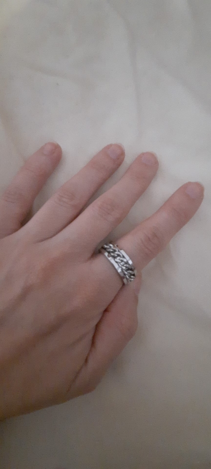 классное, эффектное кольцо. размер соответствует размерной сетке. цепь крутится. если внимательно приглядеться, то звенья немного отличаются, но это просто я придирчивая)