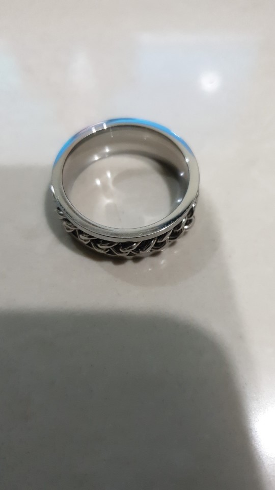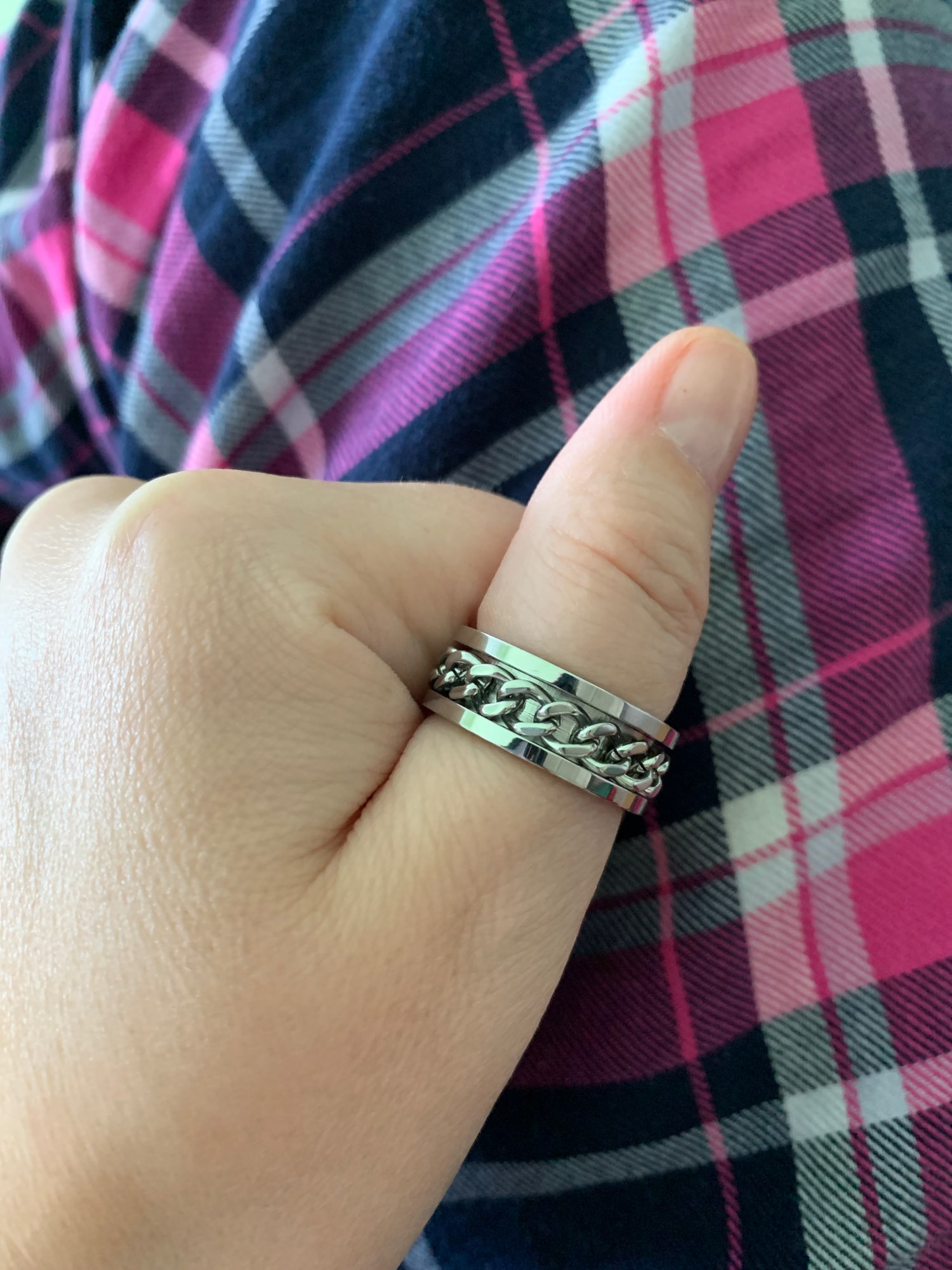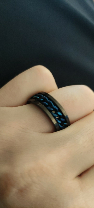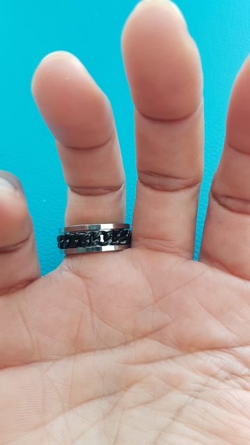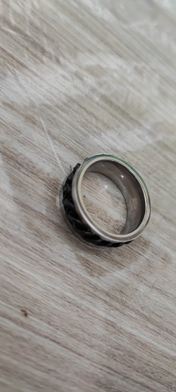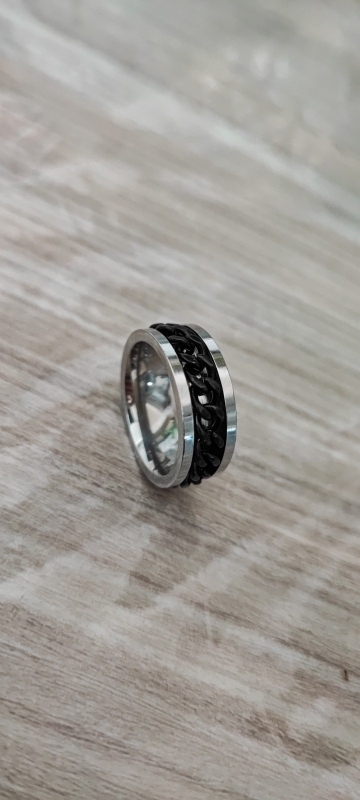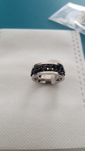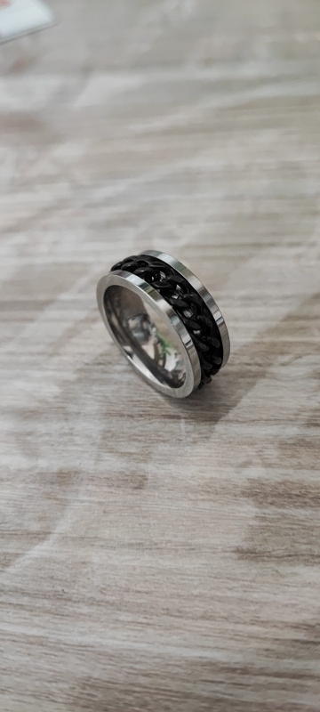 Ein wunderschöner Ring (Silberfarben, drehbares schwarzes Kettchen) mit drehbarem Rand. (Spinner). Er entspricht exakt der Beschreibung und passt so wie ich es vorher berechnet hatte. Top Qualität..!