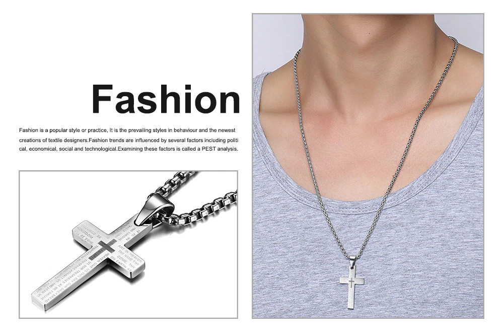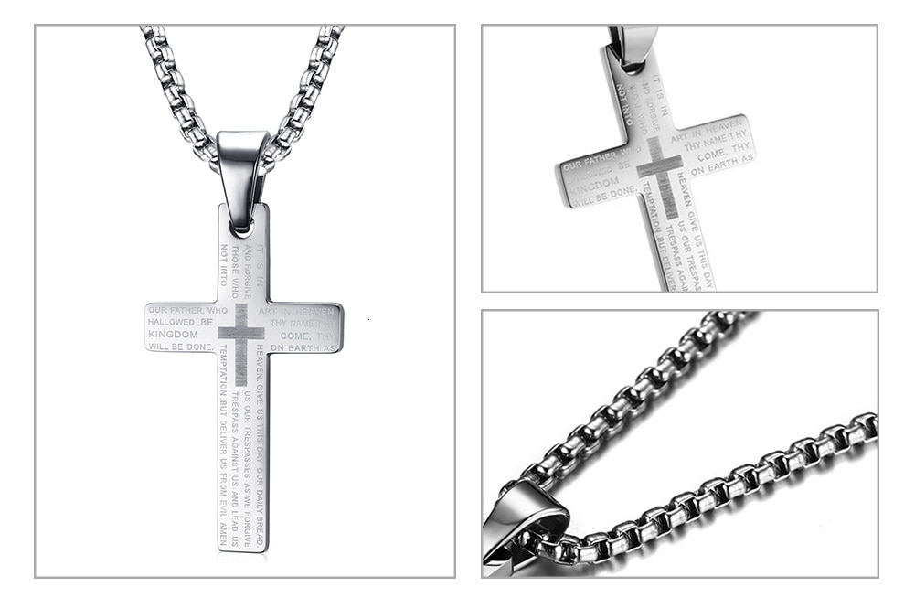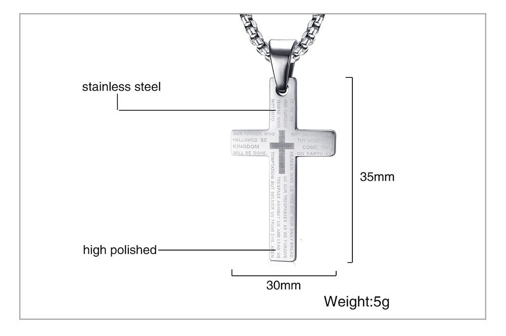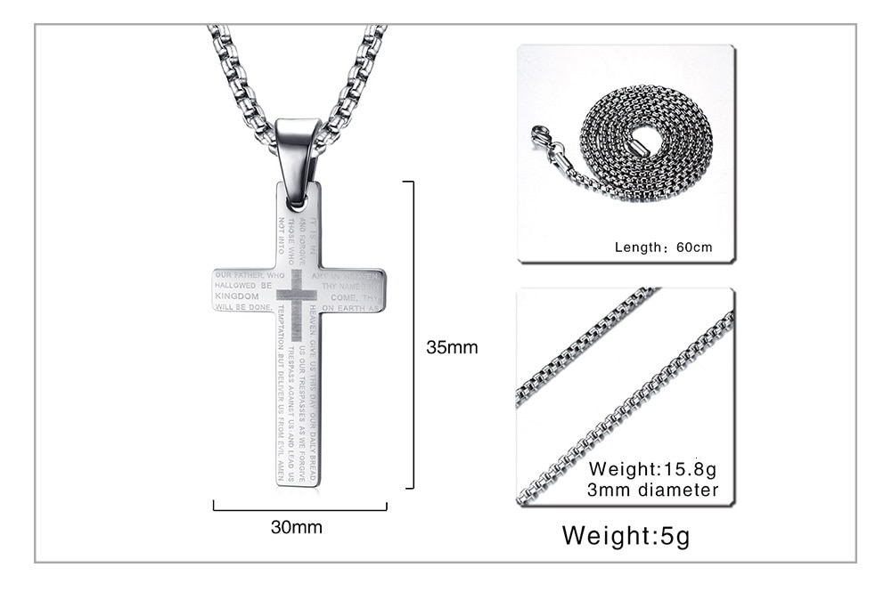 1.Material: Stainless Steel, highly resisted to rust, corrosion and tarnishing, Anti-allergy, the metal choice of high quality jewelry 2.Double cross design: cross shape pendant and engraved cross. 3.Engraved bible prayer, best prayer jewelry. 4.Pendant size:30mm*35mm; Chain: 60cm/24″ stainless steel box chain 5.Tracking information available to ensure your shipment. PRODUCT PHOTOS