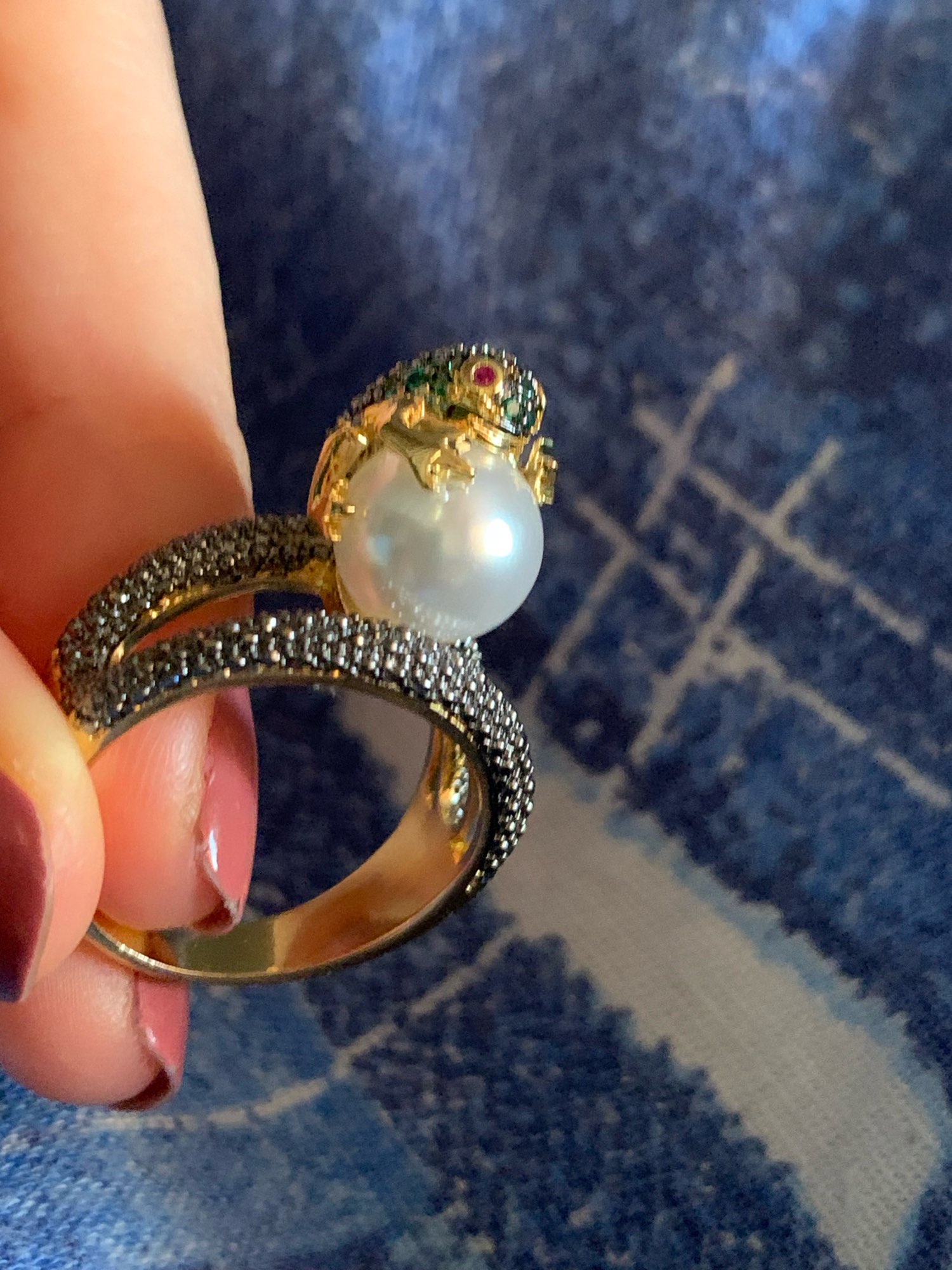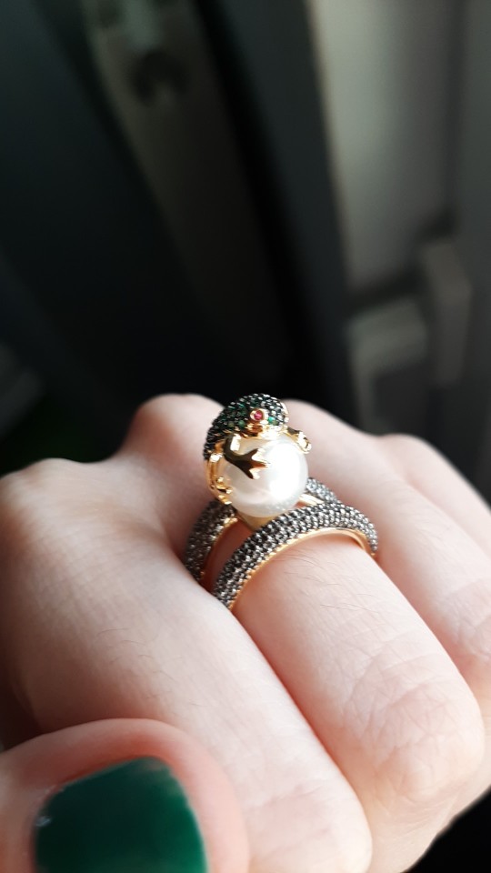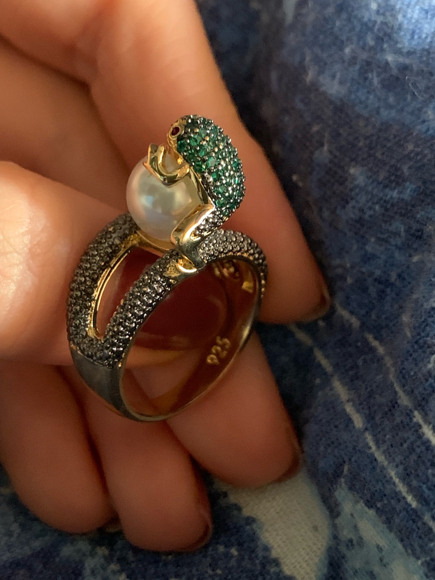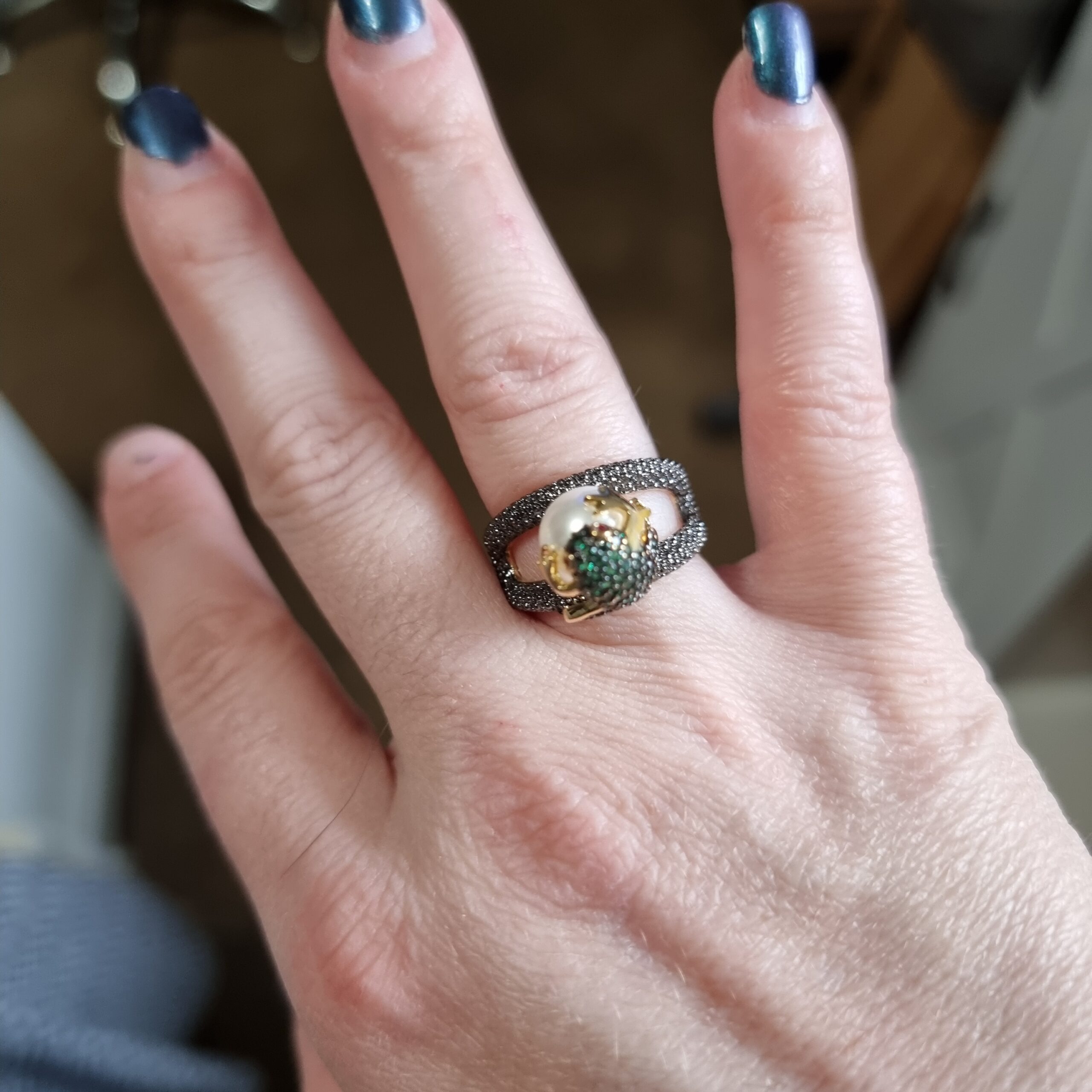 Огонь! Красота! Блестит! Лягушка маленькая, но все детали просматриваются, даже глазки малинового цвета и пальчики на лапках. Кольцо возвышается, но громоздким не смотрится. Рекомендую!