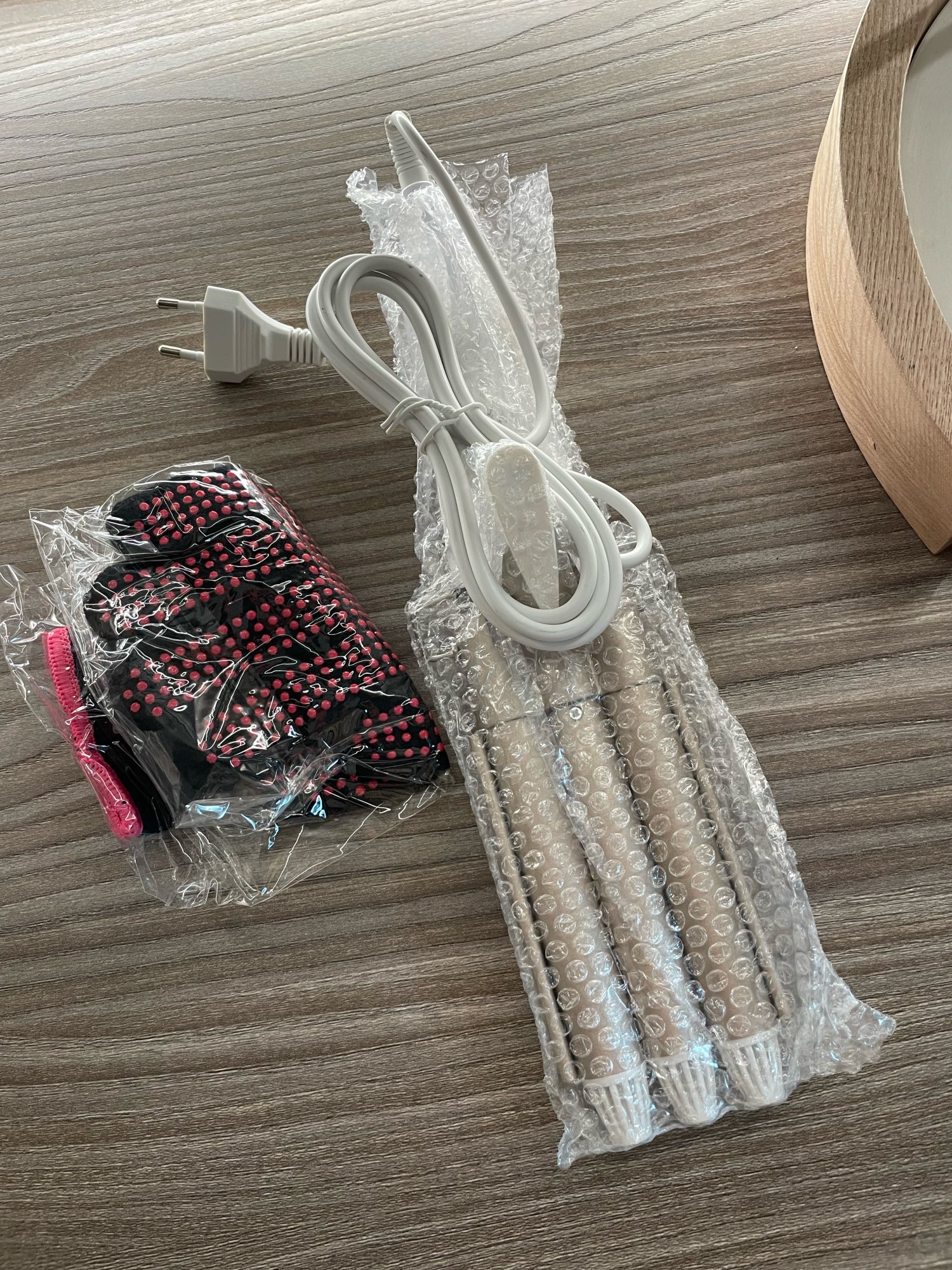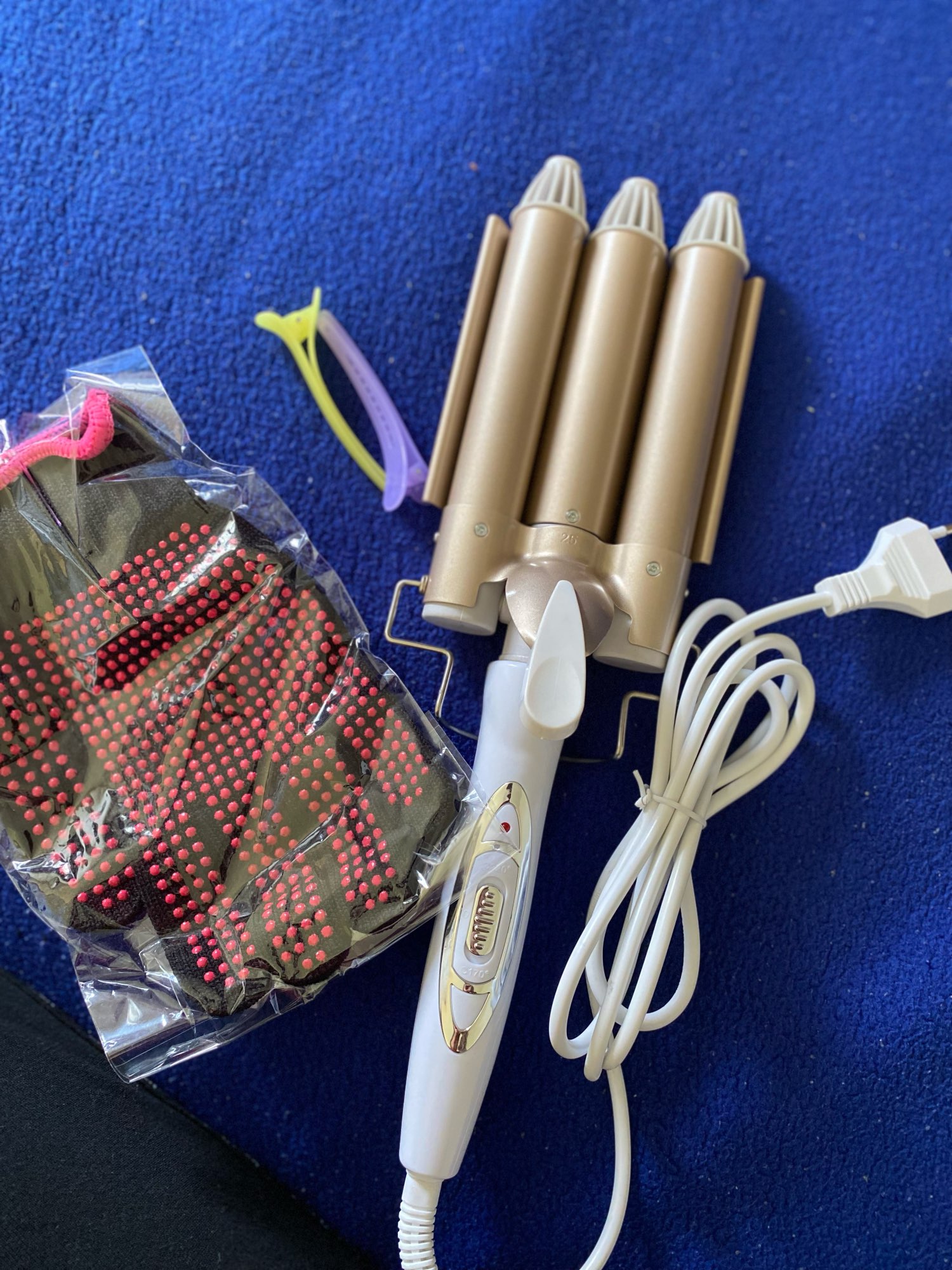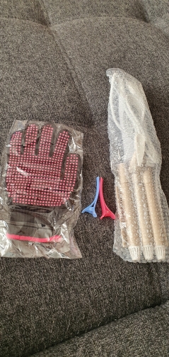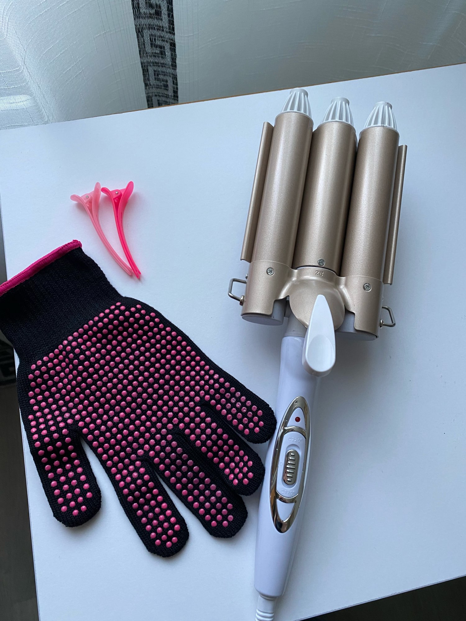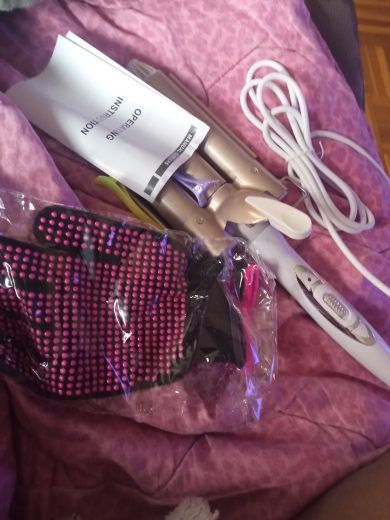 Все как в описании! Нагревается быстро. В комплекте плойка, варежка и 2 заколки