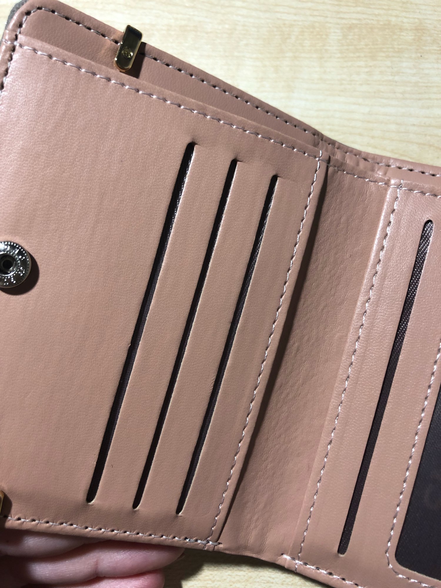 Только ненадежная заклёпка, при первом открывании начала отрываться от своей основы. Чтобы открывать кошелек нужно прижимать клёпку у материалу.